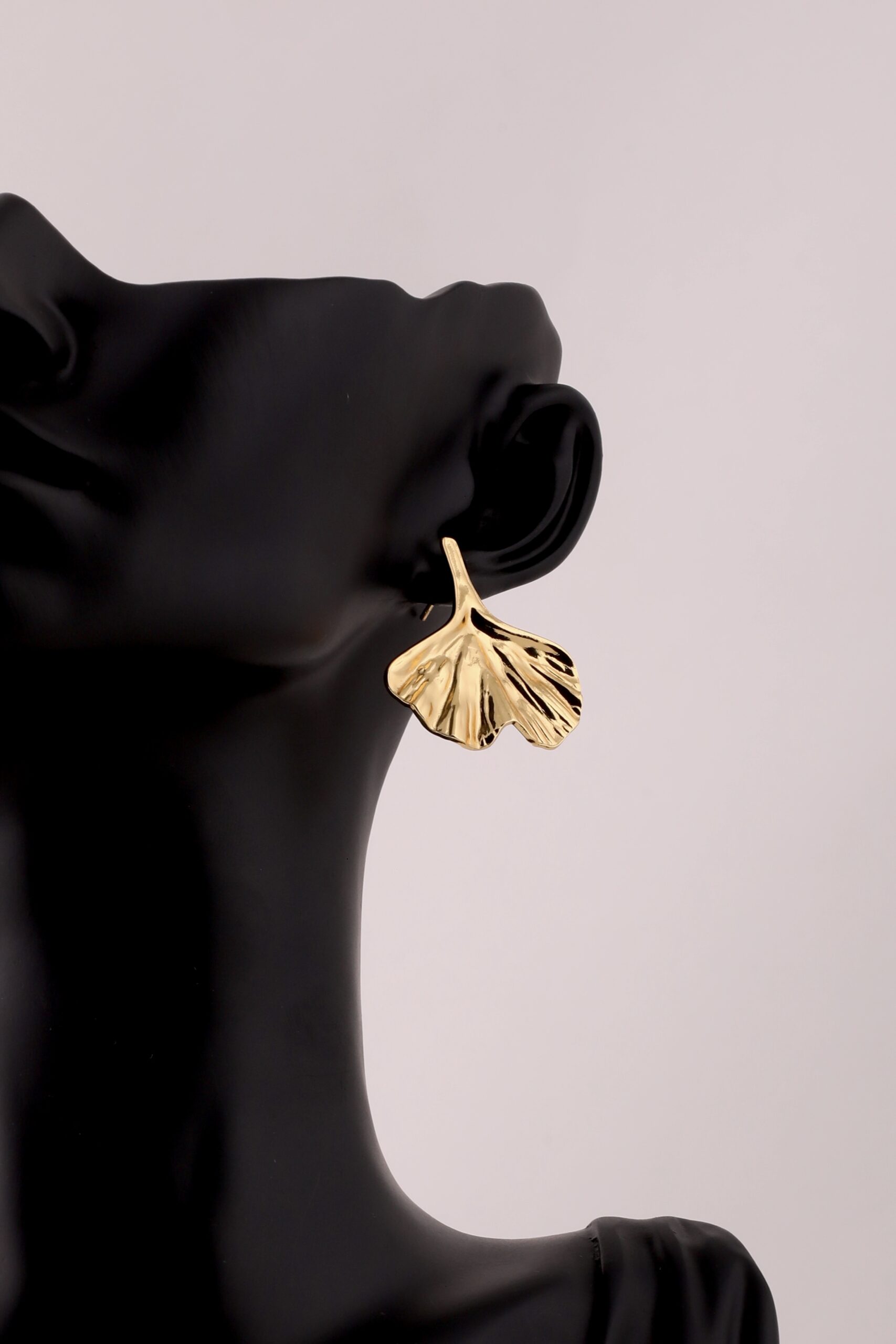 Elegant drop earrings inspired by the delicate beauty of the ginkgo leaf. Featuring a sculpted, fan-shaped design with fine textured details, these earrings catch the light beautifully for a refined yet modern look. Their fluid silhouette adds a graceful touch to any outfit, making them a timeless statement piece.