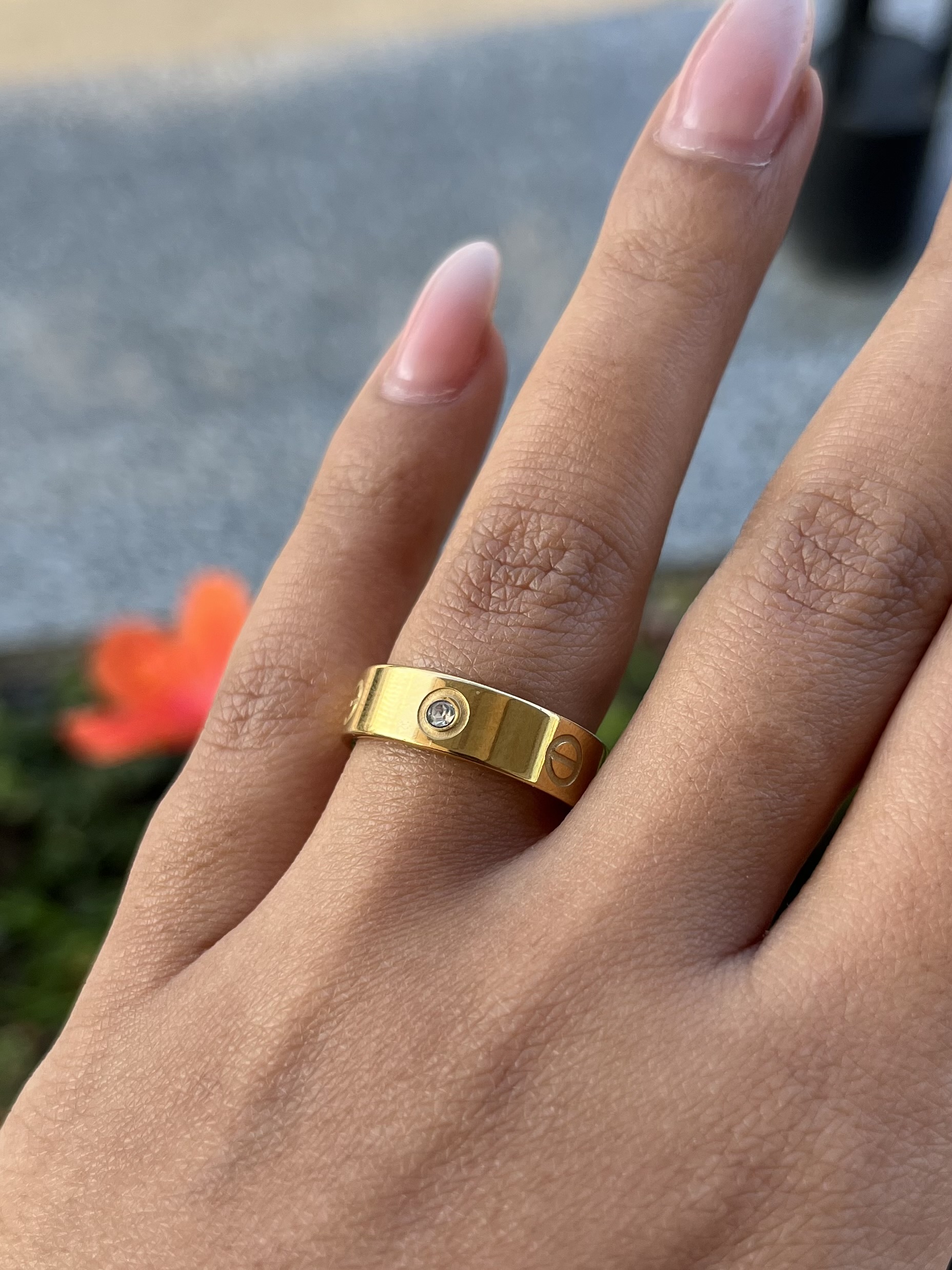 A sleek and sophisticated band ring featuring a polished gold finish with iconic screw-inspired details and a subtle crystal accent at the center. Designed to balance modern elegance with timeless appeal, this ring is perfect for everyday wear or effortless stacking.