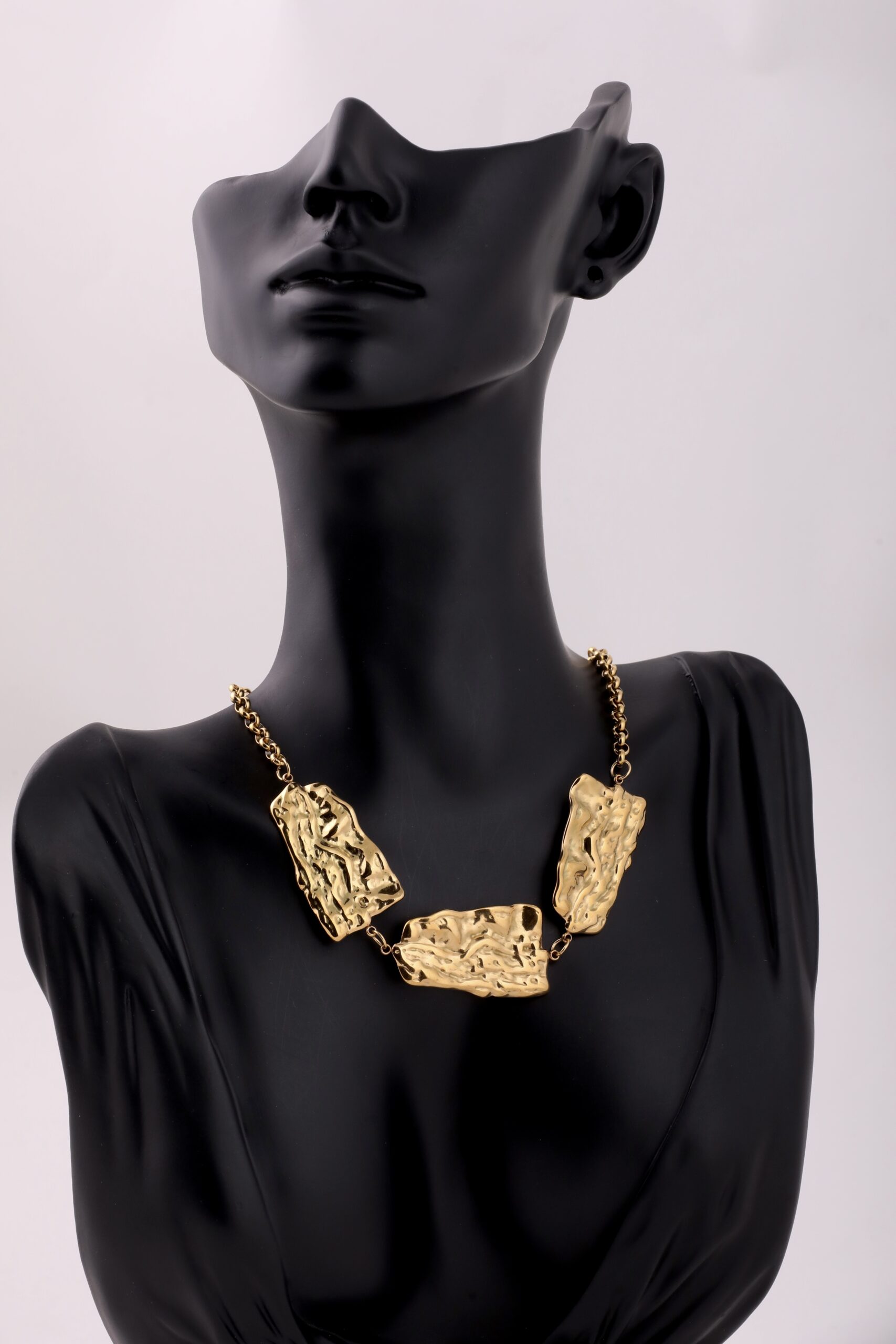 A sleek necklace featuring three elongated rectangular elements with a textured, irregular finish that catches the light beautifully. The slightly curved surfaces add depth and movement, giving the piece a bold yet refined look.